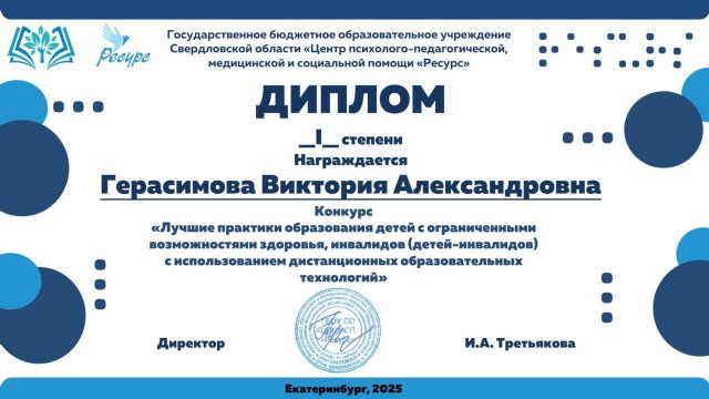 Диплом I степени за участие в областном конкурсе "Лучшие практики образования детей с ОВЗ, инвалидов (детей-инвалидов) с использованием ДОТ", г.Екатеринбург, ГБОУ СО "Центр психолого-педагогической, медицинской и социальной помощи"Ресурс".